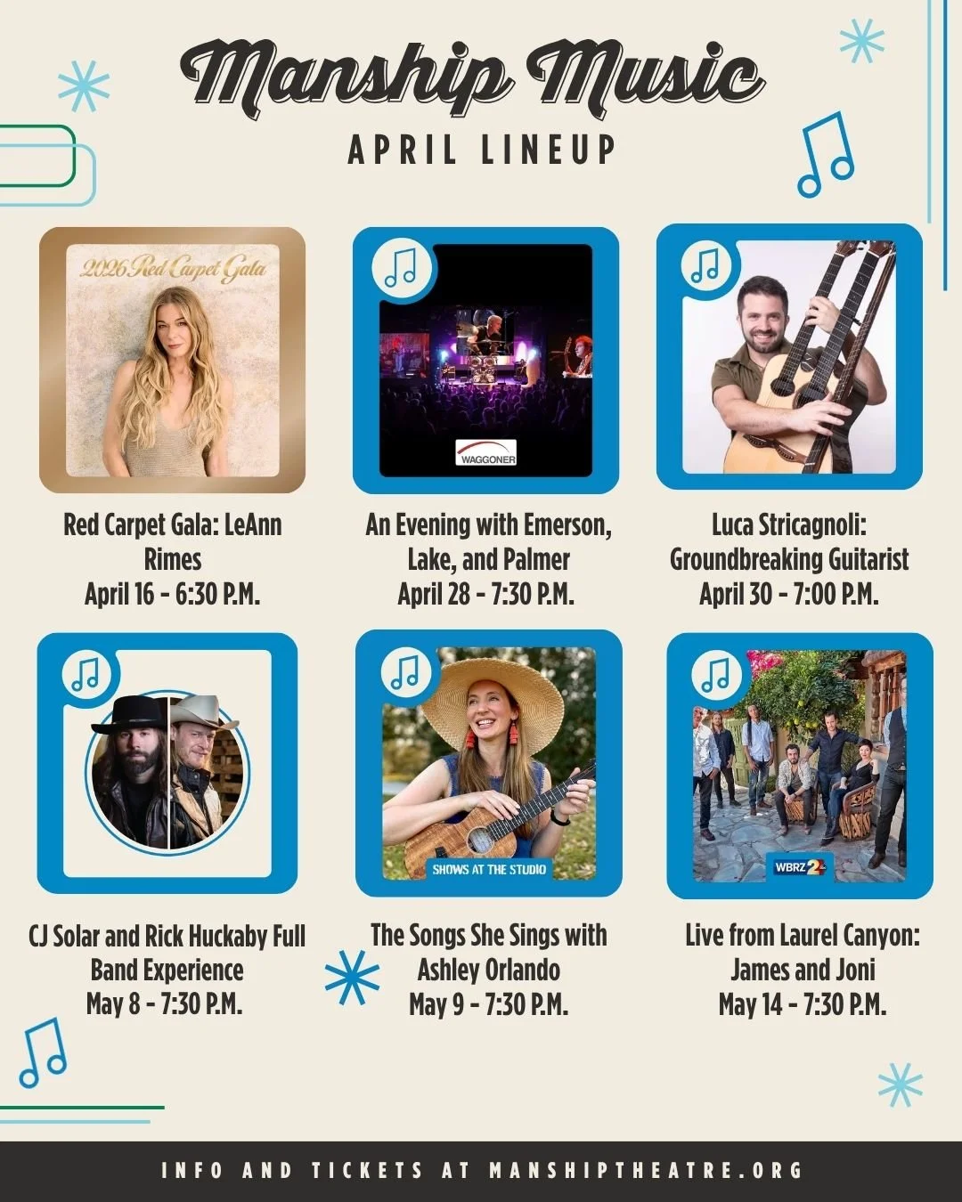 Manship Theatre We are the home for music, performing arts, exhibits, and film in Baton Rouge. See What's Coming Soon Host Your Event Here Member Login Coming Soon Coming Soon Apr 3 Apr 3, 2026 Family Dinner Improv Comedy Troupe • Shows at the Studio Apr 3, 2026 Apr 3, 2026 Apr 4 Apr 4, 2026 Billy Idol Should Be Dead (2026) Apr 4, 2026 Apr 4, 2026 Apr 4 Apr 4, 2026 Billy Idol Should Be Dead (2026) Apr 4, 2026 Apr 4, 2026 Apr 7 Apr 7, 2026 Jurassic Jam Apr 7, 2026 Apr 7, 2026 Apr 7 Apr 7, 2026 The Godfather (1972) - $5 Movie) Apr 7, 2026 Apr 7, 2026 Apr 8 Apr 8, 2026 Science on Screen: Eternal Sunshine of the Spotless Mind Apr 8, 2026 Apr 8, 2026 Apr 11 Apr 11, 2026 EPiC: Elvis Presley in Concert (2026) Apr 11, 2026 Apr 11, 2026 Apr 11 Apr 11, 2026 EPiC: Elvis Presley in Concert (2026) Apr 11, 2026 Apr 11, 2026 Apr 12 Apr 12, 2026 In the Mood for Love (25th Anniversary Screening) Apr 12, 2026 Apr 12, 2026 See All Upcoming Events Just Announced Coming Soon Apr 7 Films at Manship, PBS Kids, Free Screening, Just Announced Jurassic Jam Films at Manship, PBS Kids, Free Screening, Just Announced Films at Manship, PBS Kids, Free Screening, Just Announced Apr 11 Films at Manship, Just Announced EPiC: Elvis Presley in Concert (2026) Films at Manship, Just Announced Films at Manship, Just Announced Apr 12 Films at Manship, Just Announced In the Mood for Love (25th Anniversary Screening) Films at Manship, Just Announced Films at Manship, Just Announced Apr 16 Just Announced, Gala Red Carpet Gala: LeAnn Rimes Just Announced, Gala Just Announced, Gala Apr 19 Family, Theatre, Education, Just Announced Lightwire Theater in Mid City! Family, Theatre, Education, Just Announced Family, Theatre, Education, Just Announced May 8 Just Announced CJ Solar and Rick Huckaby Full Band Experience Just Announced Just Announced May 9 Just Announced, Gallery at Manship Artist Talk with Brandon V. Lewis Just Announced, Gallery at Manship Just Announced, Gallery at Manship May 9 Just Announced The Songs She Sings: A Joyful Jazz Tribute to the Women Who Raised Us with Ashley Orlando Just Announced Just Announced May 14 Just Announced Live from Laurel Canyon: James and Joni Just Announced Just Announced May 17 Films at Manship, Free Screening, Just Announced, PBS Kids The Grocery List Show (Free Screening and Panel) Films at Manship, Free Screening, Just Announced, PBS Kids Films at Manship, Free Screening, Just Announced, PBS Kids May 27 Just Announced, Films at Manship, Jones Walker Foyer Michalopoulos: The Art of Celebration (Screening + Q&A) Just Announced, Films at Manship, Jones Walker Foyer Just Announced, Films at Manship, Jones Walker Foyer Jun 25 Just Announced Andrew Duhon Just Announced Just Announced Follow Us Check out what we’ve been up to on Instagram View fullsize View fullsize View fullsize View fullsize