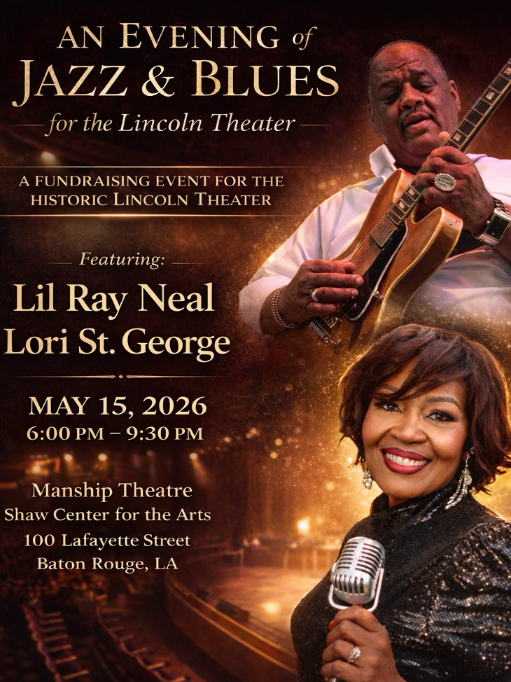 Join us for an unforgettable night of smooth jazz and soulful blues to support the Historic Landmark, the Lincoln Theatre. at the Manship Theatre – Shaw Center for the Arts in downtown Baton Rouge